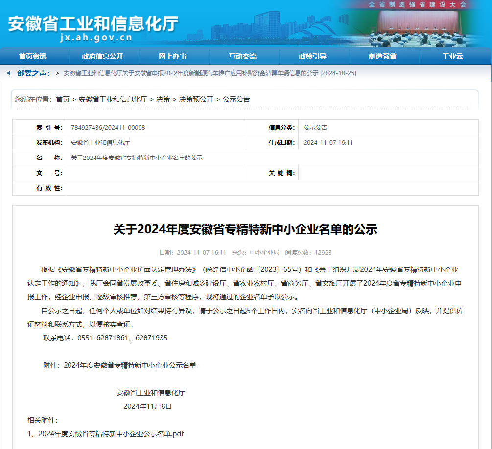 近日安徽省工業(yè)和信息化廳發(fā)布了2024年度專精特新中小企業(yè)公示名單集團所屬池州市數(shù)據(jù)產(chǎn)業(yè)有限公司榮獲2024年度安徽省“專精特新”中小企業(yè)。