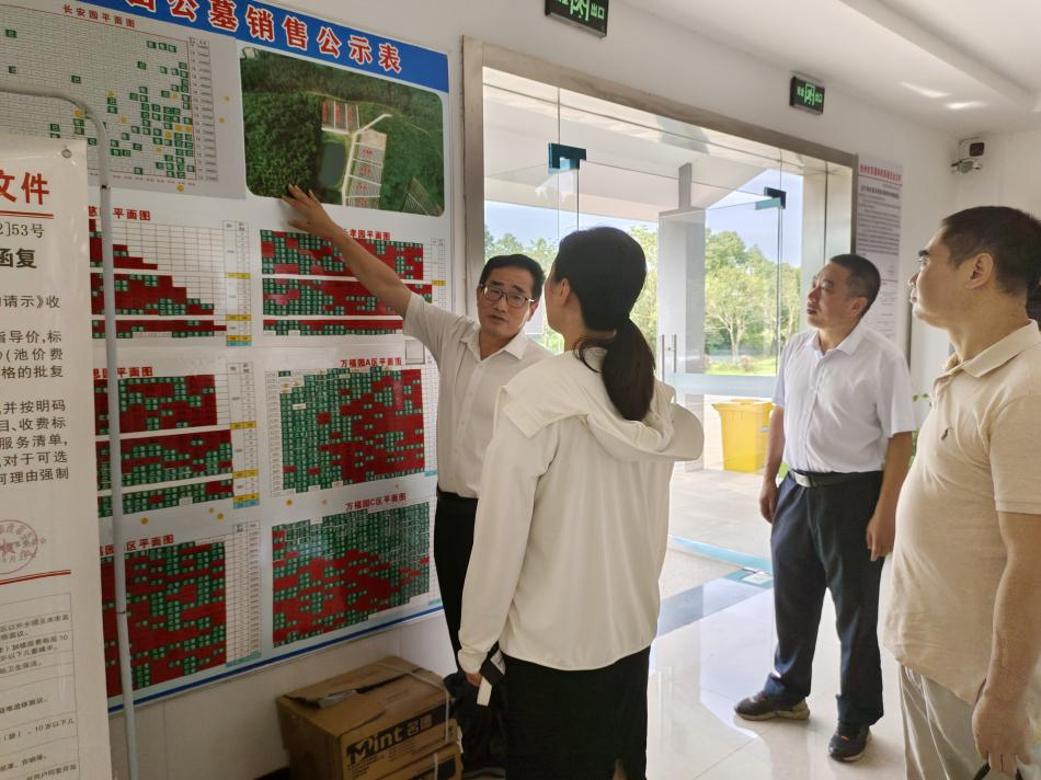 朱蕓蕓一行先后參觀了生態(tài)人文公司服務(wù)接待大廳、公墓銷售公示欄,聽取了生態(tài)人文公司目前安全生產(chǎn)、服務(wù)經(jīng)營等方面工作匯報,并實地察看了池州生態(tài)人文紀念園項目施工現(xiàn)場,深入了解了園區(qū)規(guī)劃、公益性墓區(qū)、骨灰堂等工程建設(shè)相關(guān)情況。