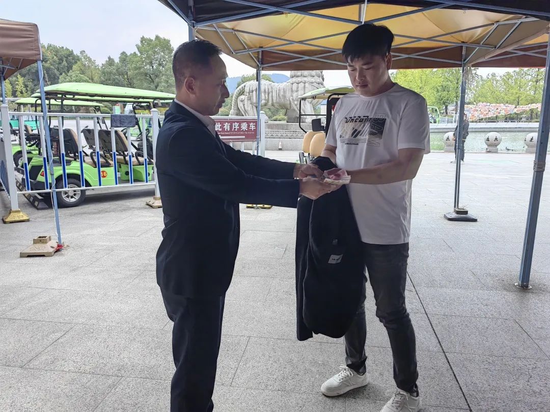 10月12日,胡先生及其朋友來(lái)文化園游玩,在景交車起點(diǎn)站乘車時(shí)將外套遺忘在站點(diǎn),衣服口袋內(nèi)有幾千元現(xiàn)金和相關(guān)證件。辦理自駕車登記的趙小平在例行檢查時(shí),發(fā)現(xiàn)遺失的衣物和現(xiàn)金,便第一時(shí)間詢問(wèn)周邊游客并及時(shí)匯報(bào)到部門,同時(shí)在公司全員群內(nèi)發(fā)布信息,集合全員力量尋找失主。