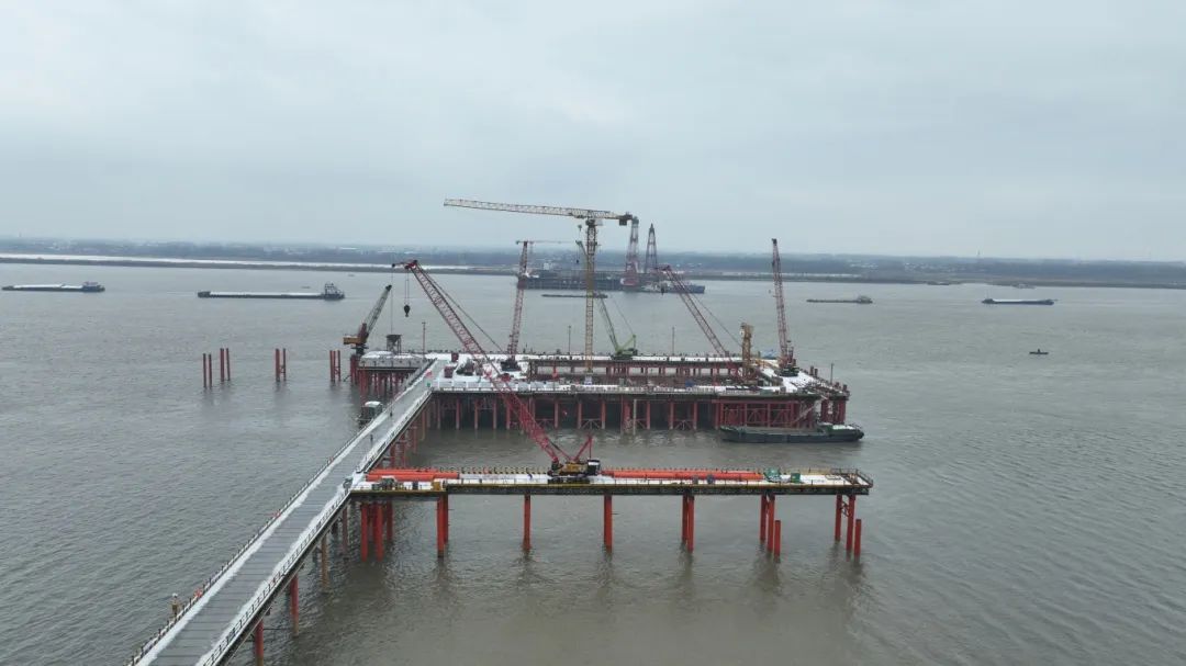 春節(jié)過后,池州港烏沙港區(qū)公用碼頭項目施工人員以時不我待的精神,鉚足干勁抓緊度、忙生產,確保施工現(xiàn)場有序推進。截至目前,該項目水域部分碼頭平臺面層、兩座汽車引橋已全部澆筑完成,項目整體進度已完成約82%,碼頭工程主體結構與房建工程主體結構已全部施工完成,目前正在進行碼頭前沿鋼結構安裝、房建工程裝飾裝修、鋼引橋吊裝、水電安裝等施工作業(yè)。同時碼頭陸域部分已完成招標工作,目前正在進行開工籌備工作。