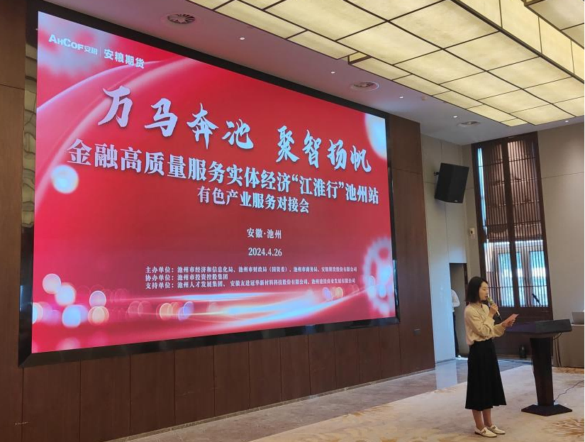 本次會議由池州市經(jīng)濟(jì)信息化局、池州市財(cái)政局(國資委)、池州市商務(wù)局、安糧期貨股份有限公司主辦,池州市投資控股集團(tuán)協(xié)辦,安徽友進(jìn)冠華新材料科技股份有限公司、池州建投商業(yè)發(fā)展有限公司提供支持,邀請了池州市鎂鋁銅相關(guān)企業(yè)及多家金融機(jī)構(gòu)代表參會。池州市商務(wù)局黨組書記、局長李進(jìn)出席活動,池州市經(jīng)濟(jì)與信息化局副局長朱宇、安糧期貨董事長韓文輝先后致辭。